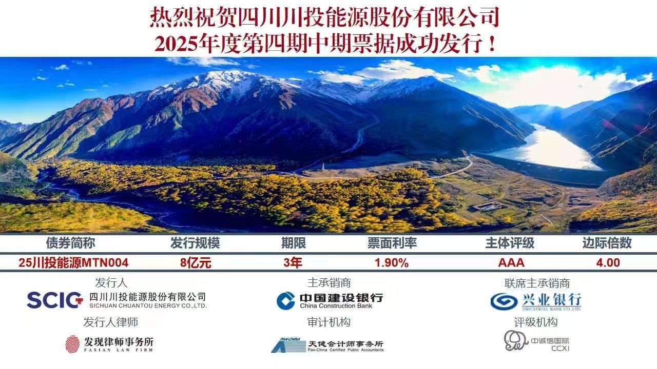9月19日,川投能源成功發(fā)行2025年度第四期中期票據(jù)。本期中期票據(jù)發(fā)行規(guī)模為8億元,發(fā)行期限3年,發(fā)行利率1.90%,邊際認(rèn)購倍數(shù)4.00倍,實(shí)現(xiàn)全額募集。