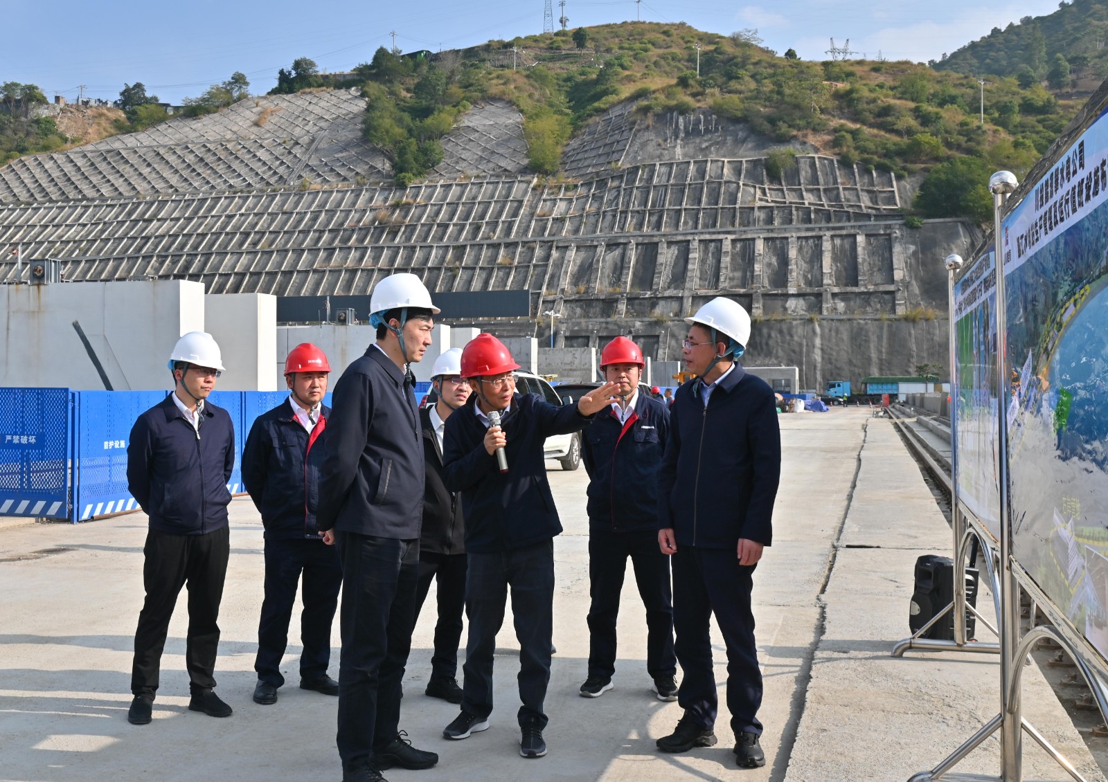 鄧超一行深入銀江水電站項目施工現(xiàn)場,實地查看了大壩壩頂、中控室、安裝間等區(qū)域安全生產(chǎn)情況,并現(xiàn)場聽取了攀水電公司關(guān)于工程建設(shè)、生產(chǎn)運行、安全環(huán)保等工作落實情況的匯報。