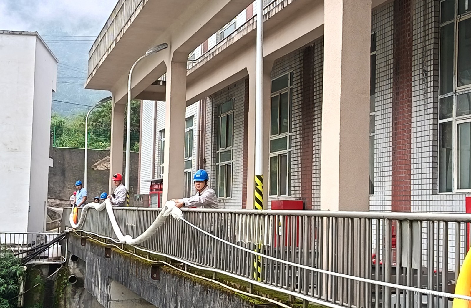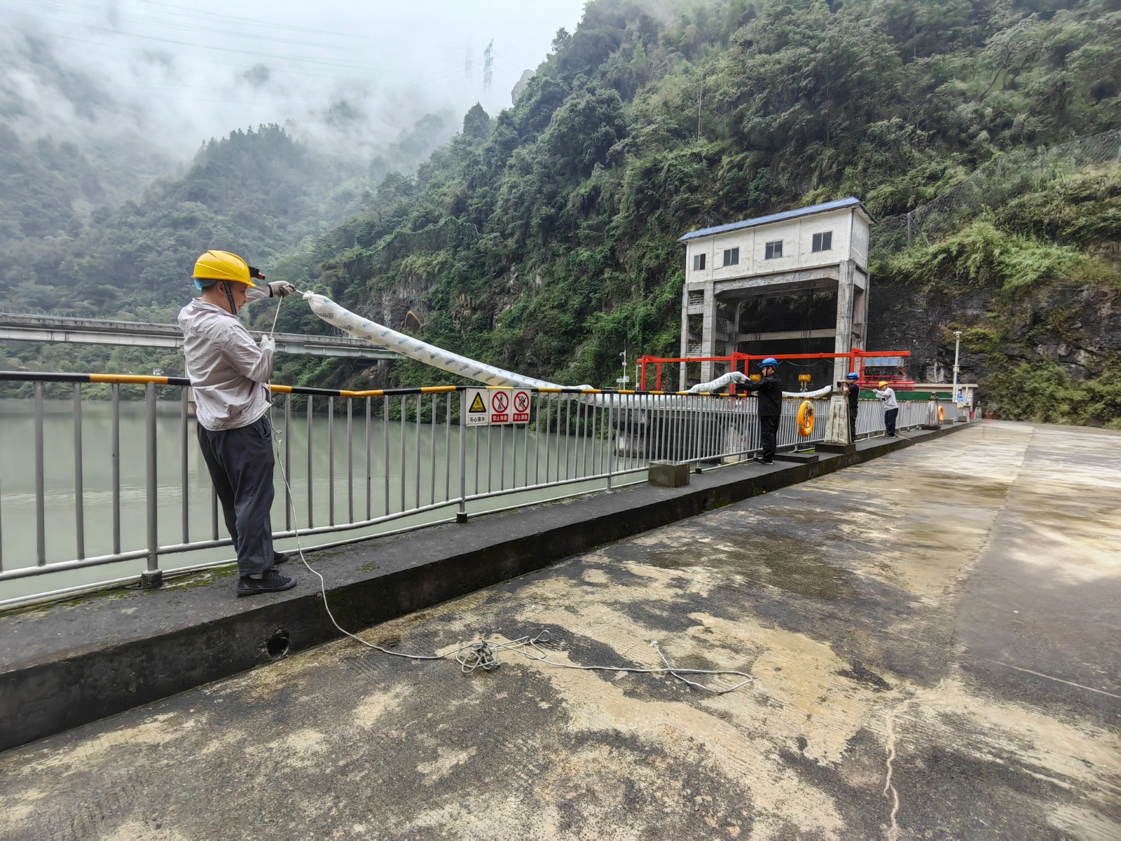 本次演練背景設(shè)定為電站大壩2#泄洪閘左側(cè)齒輪箱突發(fā)漏油,約50升齒輪油濺落至庫(kù)區(qū)水面并擴(kuò)散,值班人員發(fā)現(xiàn)險(xiǎn)情后立即啟動(dòng)應(yīng)急響應(yīng)。中控室迅速協(xié)調(diào)上下游鍋浪蹺、匯溪電廠調(diào)整出力流量并協(xié)助布設(shè)攔油設(shè)施;運(yùn)行組與應(yīng)急搶險(xiǎn)組攜帶吸油氈、攔油索等器材趕赴現(xiàn)場(chǎng),對(duì)漏油點(diǎn)進(jìn)行封堵,同時(shí)在閘門前和水面關(guān)鍵區(qū)域鋪設(shè)攔油繩,防止污染擴(kuò)散;后勤保障組全程待命,確保物資供應(yīng)和人員安全。經(jīng)過(guò)30分鐘緊張有序的處置,油污被徹底清理,庫(kù)區(qū)水質(zhì)未受影響,演練圓滿完成。